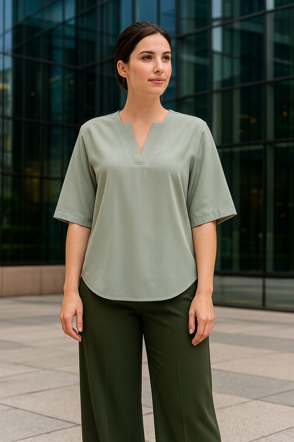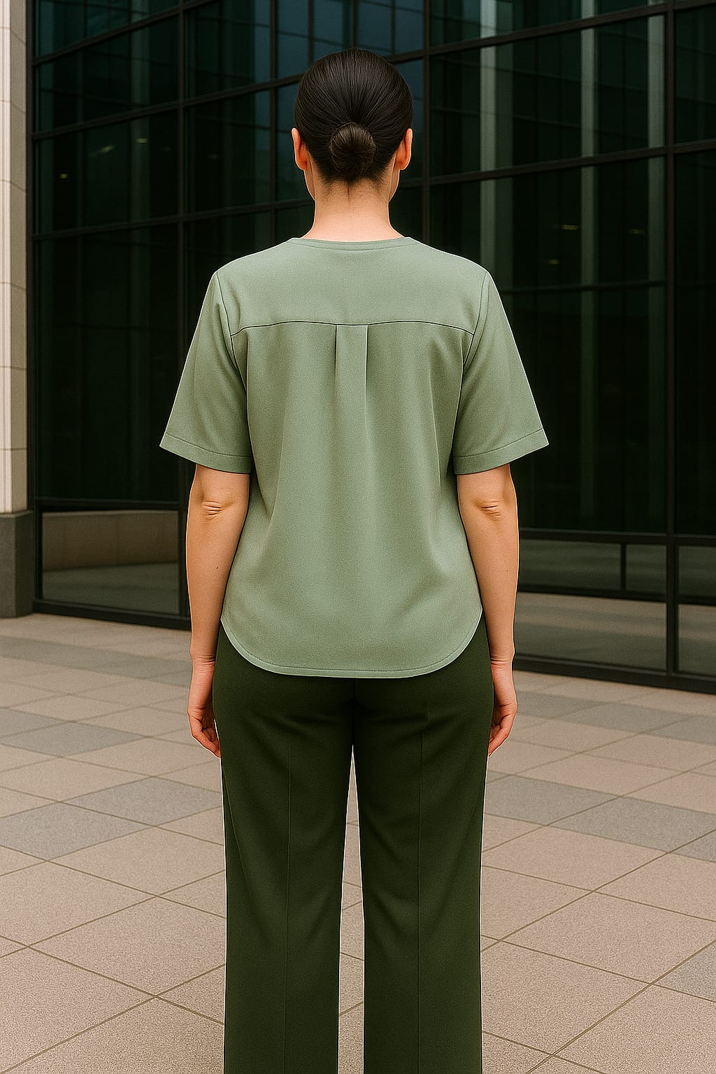 Modelo elegante, moderno, com excelente caimento, confortável, versátil e levemente acinturado. Gola em “V” estilizada, detalhe nas costas com pala e macho, manga curta.